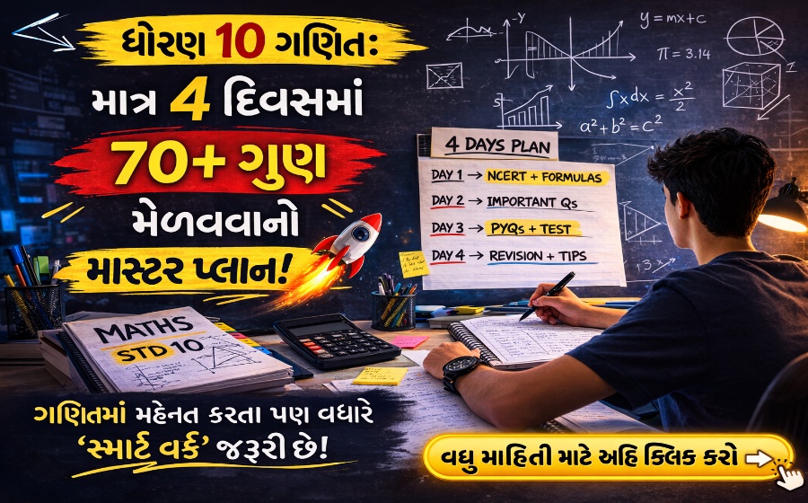 ગણિતનું પેપર નજીક છે અને સમય ઓછો છે. વિદ્યાર્થી મિત્રો, ગણિતમાં મહેનત કરતા પણ વધારે ‘સ્માર્ટ વર્ક’ જરૂરી છે. જો તમે નીચે મુજબના 4 દિવસના પ્લાનને અનુસરશો, તો તમે આસાનીથી 70+ ગુણ મેળવી શકશો.
